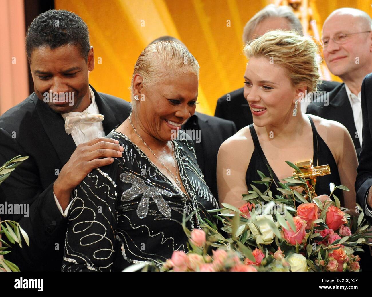 L R U S Actor Denzel Washington Singer Dionne Warwick And Actress Scarlett Johansson Appear Stage After The 47th Golden Camera Award Ceremony In Berlin February 4 2012 The Golden Cameras Goldene Kamera Are